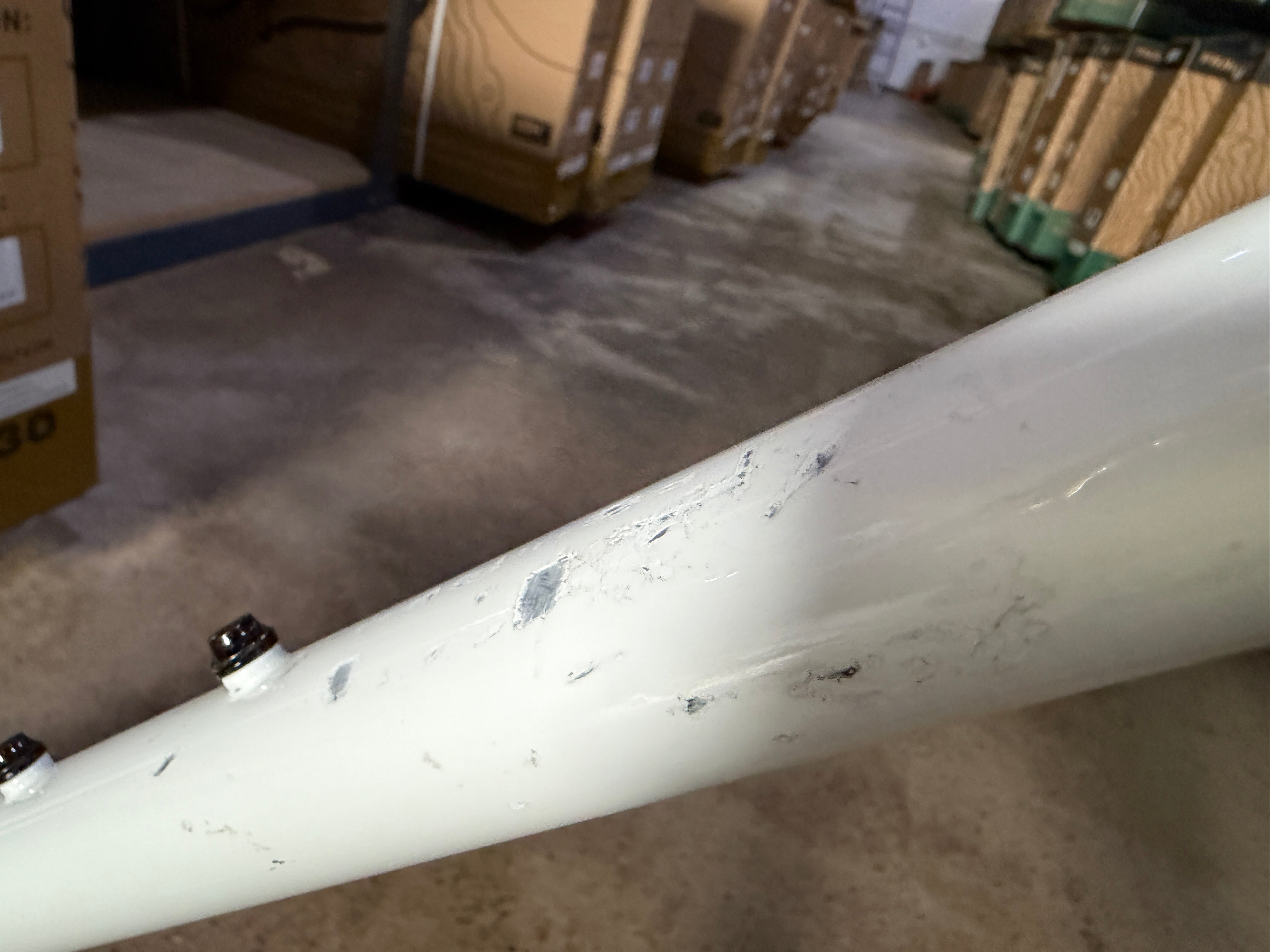 Heavily damaged down tube; scratched seat stay and rear wheel. (See Pics)